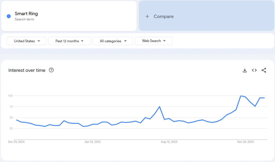 Guarda il grafico qui sopra. Questo è il volume di ricerca per "Samsung Ring" negli ultimi 90 giorni. Vedete quell'enorme picco a novembre? Cioè Samsung spende milioni di dollari per educare tuo futuri clienti. L'intuizione: Il pubblico ora sa cos'è uno Smart Ring. Ma la maggior parte dei consumatori non è disposta a pagare 399 dollari. La tendenza della ricerca si sta stabilizzando, il che significa che la "fase hype" è finita e sta iniziando la "fase di acquisto" per opzioni convenienti ($ 50-$ 80).
